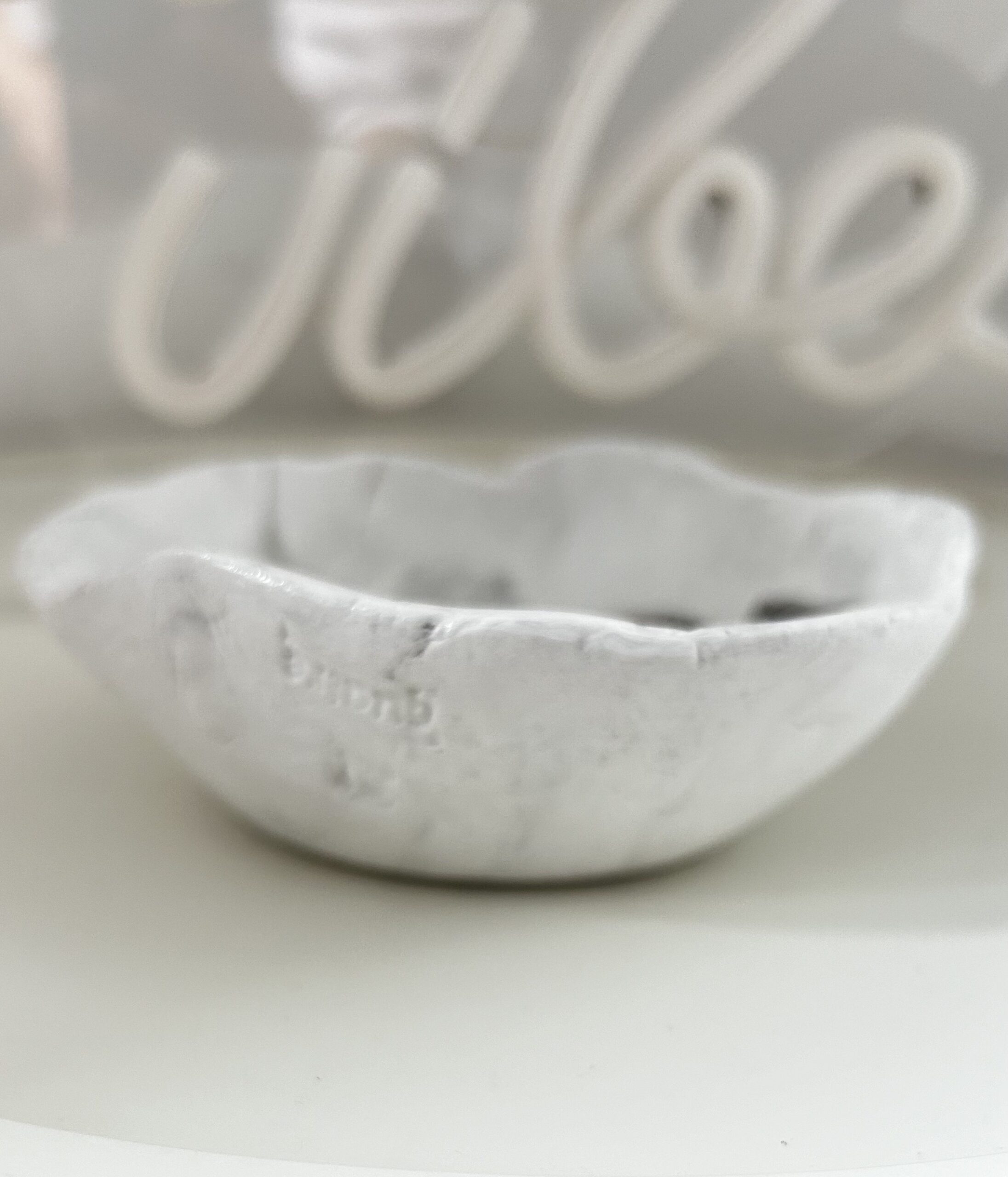 Ajoutez une touche d’élégance artisanale à votre intérieur avec cette coupelle Amour en argile auto-durcissante effet marbre blanc, façonnée et vernie à la main en Alsace. Chaque pièce est unique grâce à ses bords légèrement irréguliers, mettant en valeur l’authenticité des créations faites main.