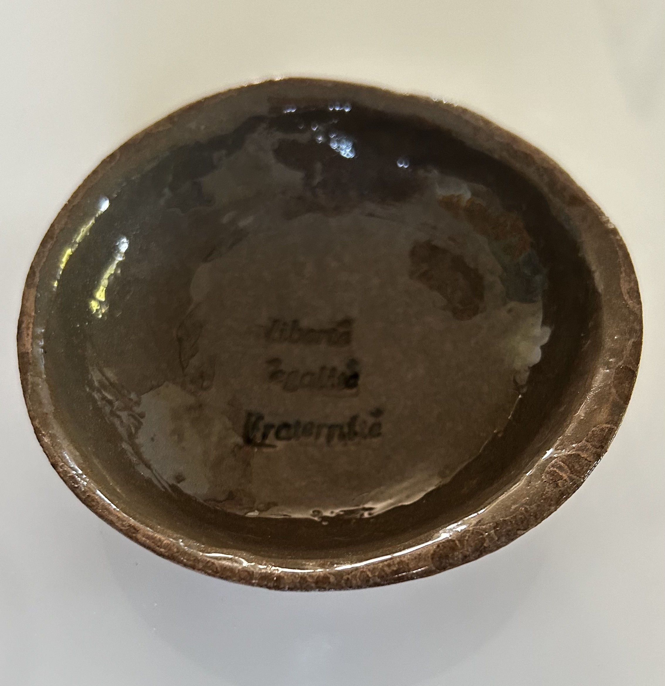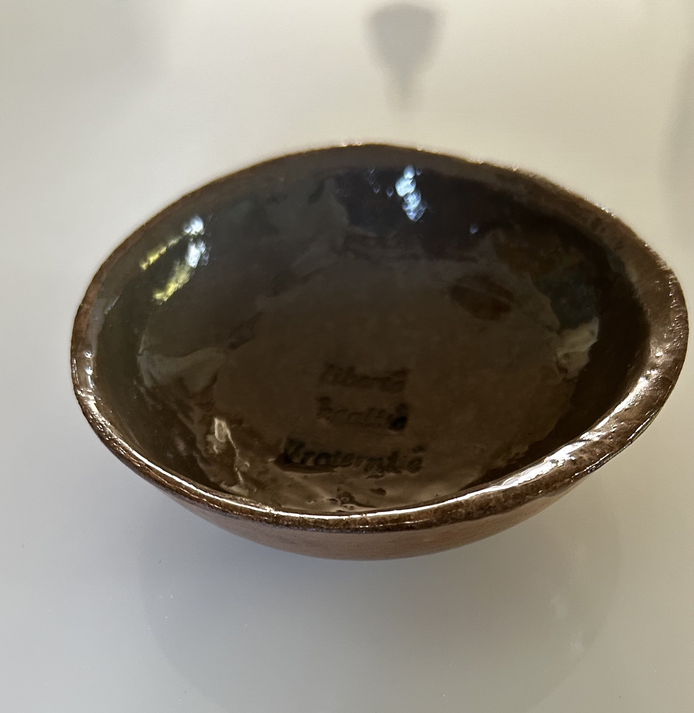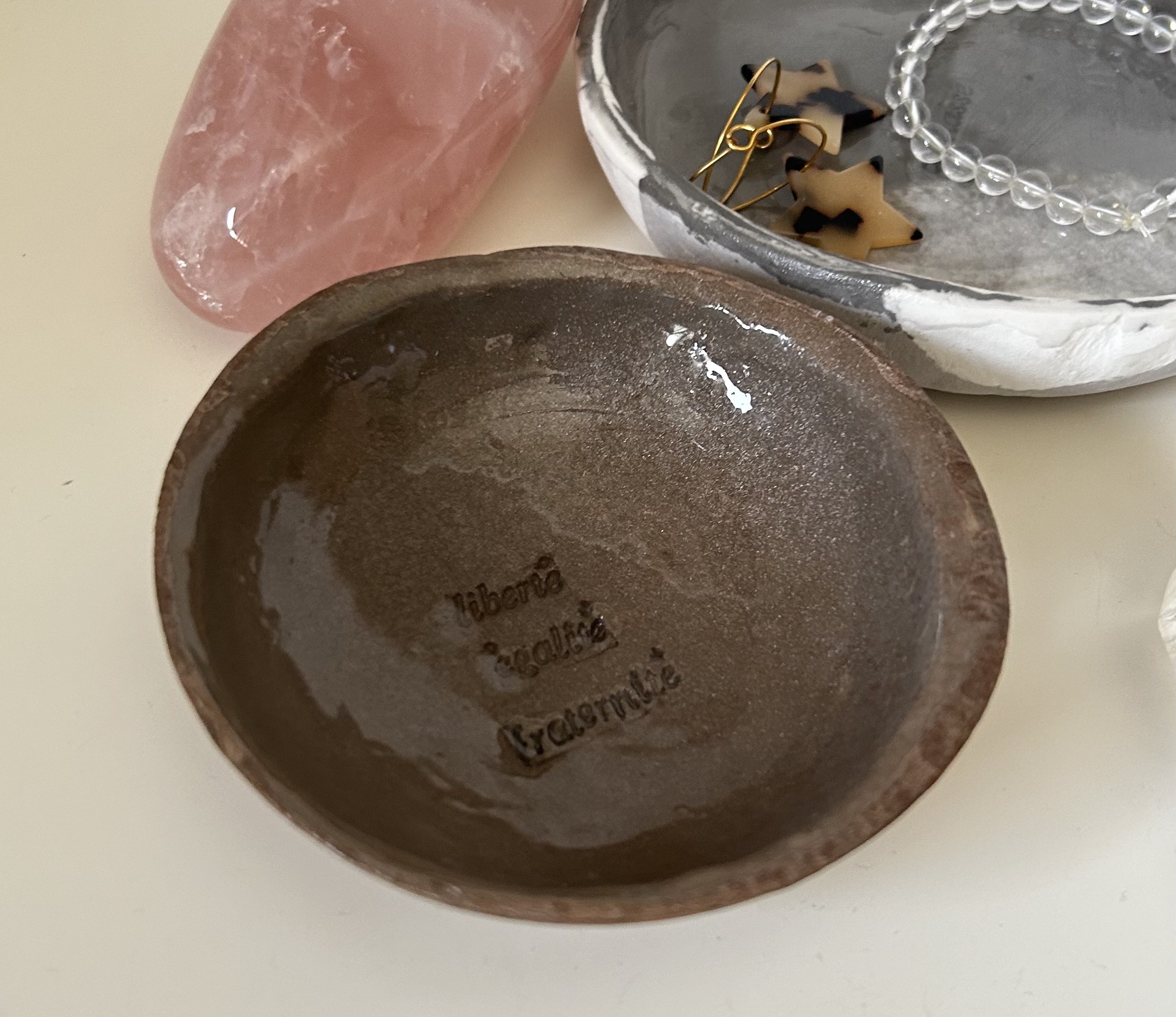 Ajoutez une touche d’élégance artisanale à votre intérieur avec cette petite coupelle Liberté, Égalité, Fraternité en argile auto-durcissante effet bronzez, façonnée et vernie à la main en Alsace. Chaque pièce est unique grâce à ses bords légèrement irréguliers, mettant en valeur l’authenticité des créations faites main.