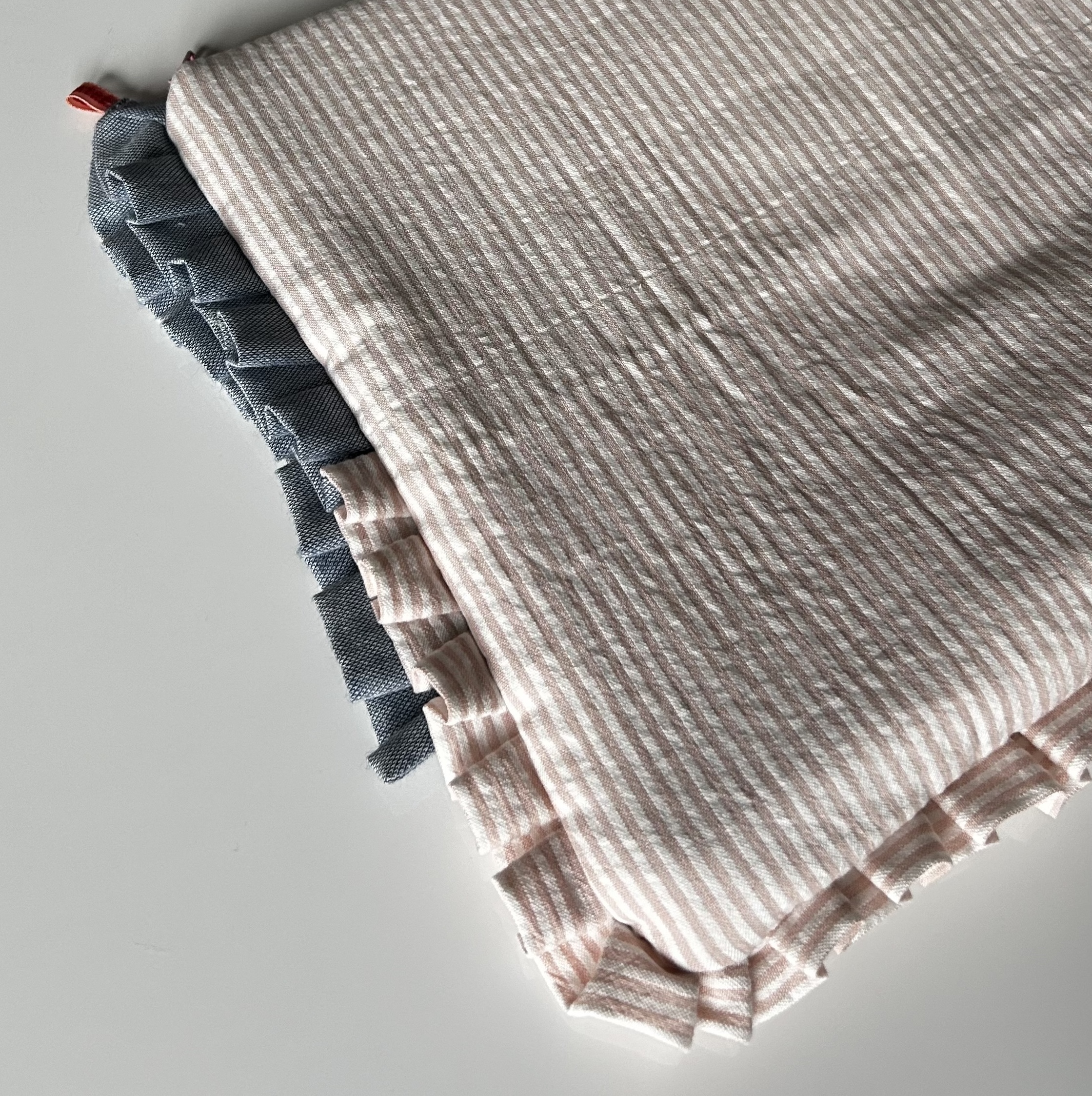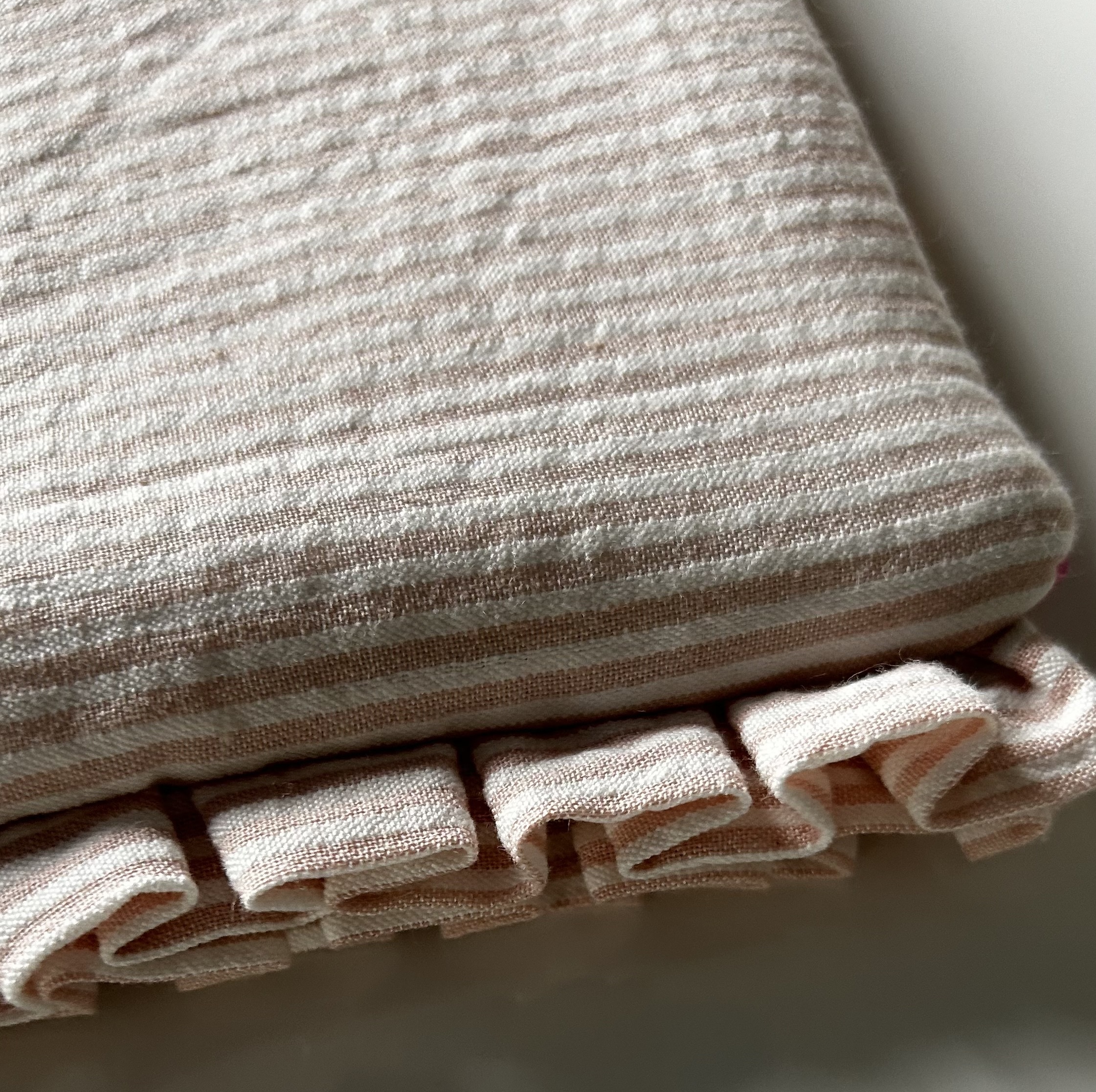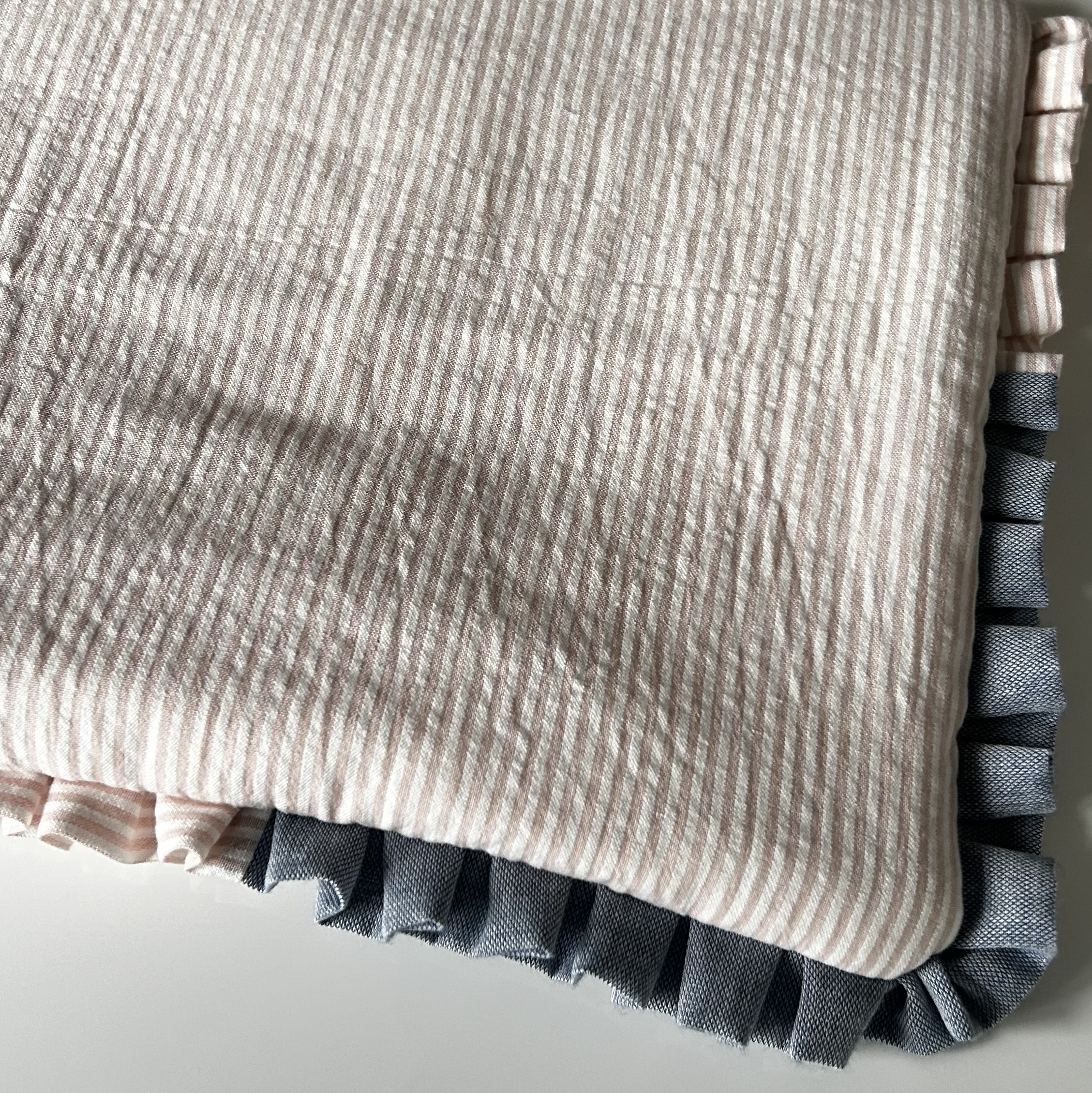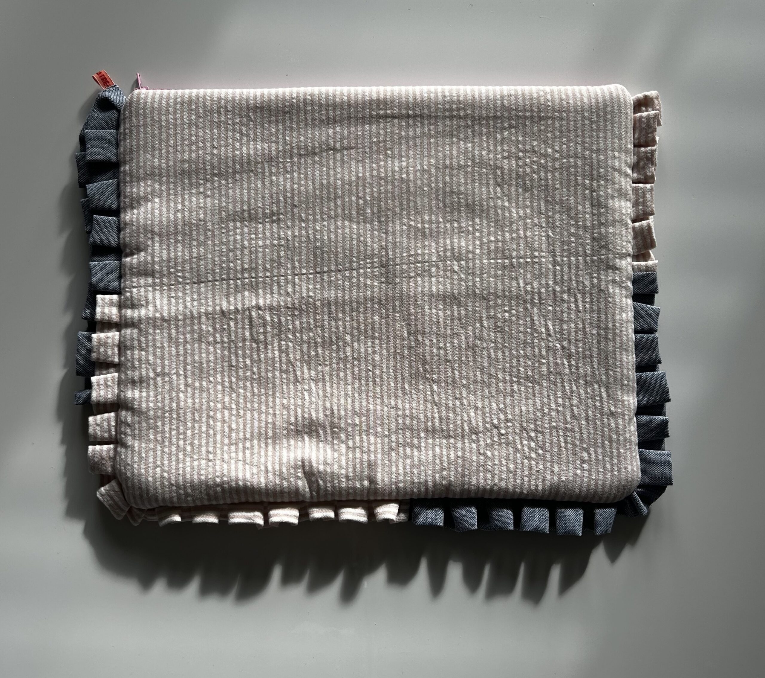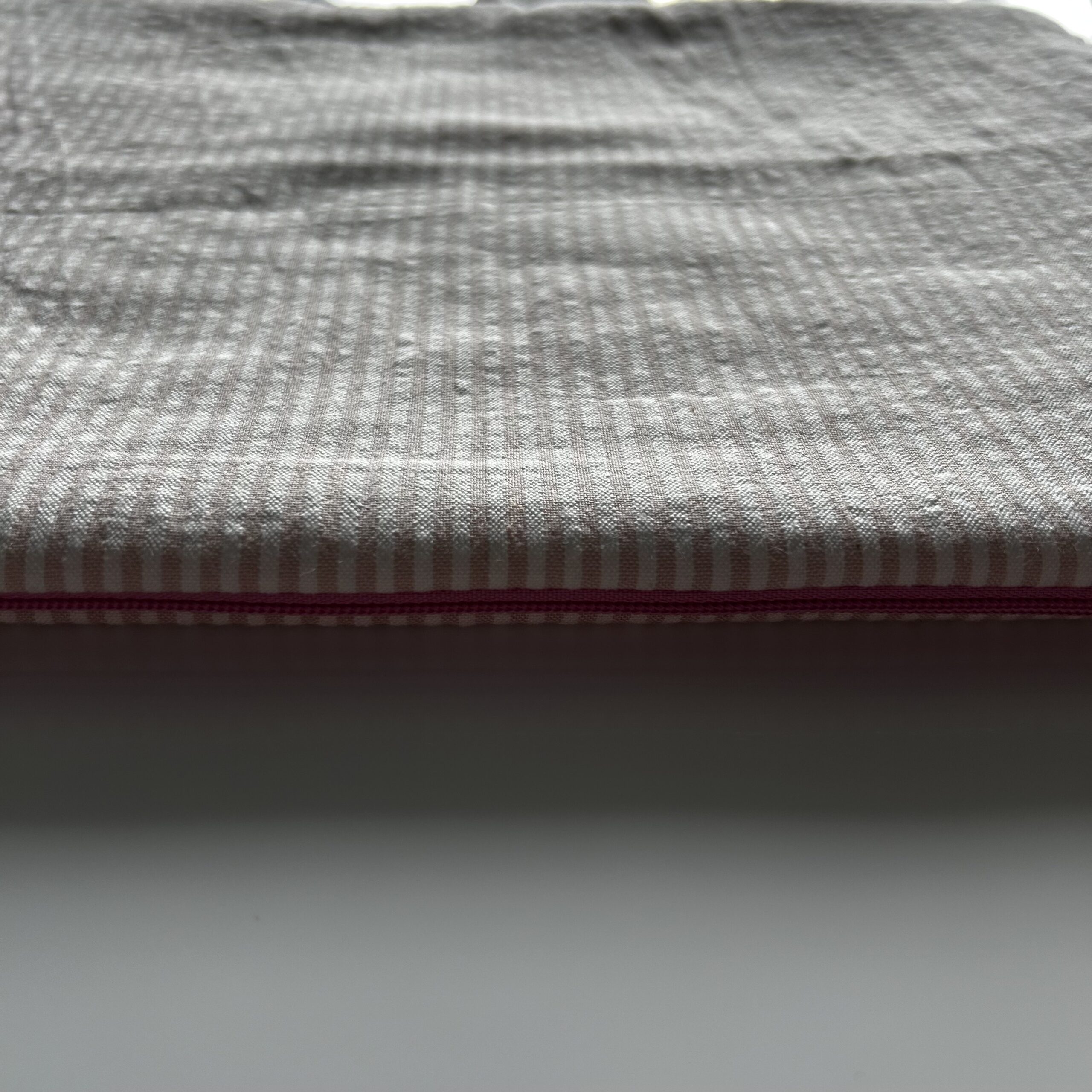 - Corps de la pochette : Tissu matelassé, rayé rose et blanc sur le recto et le verso.