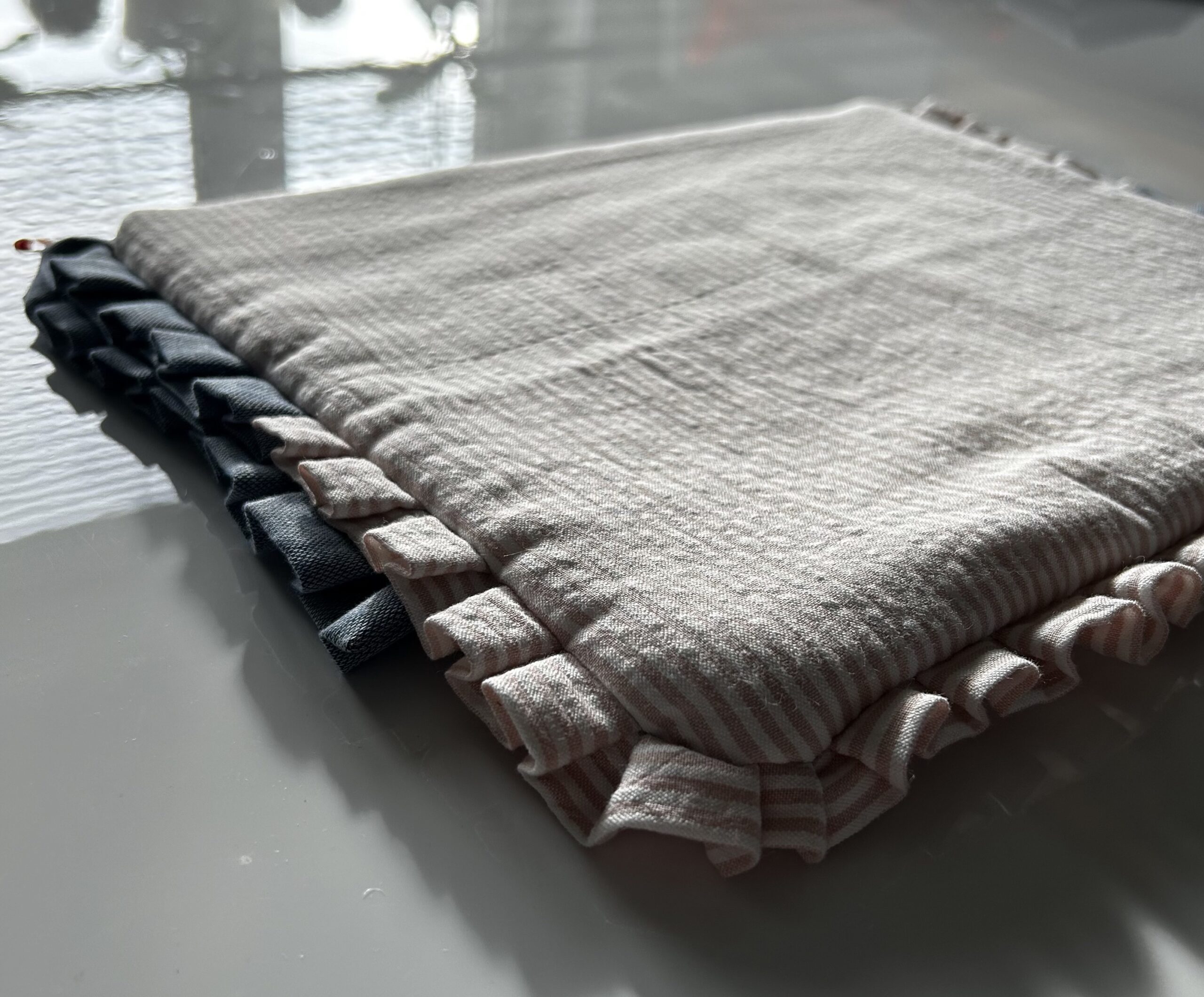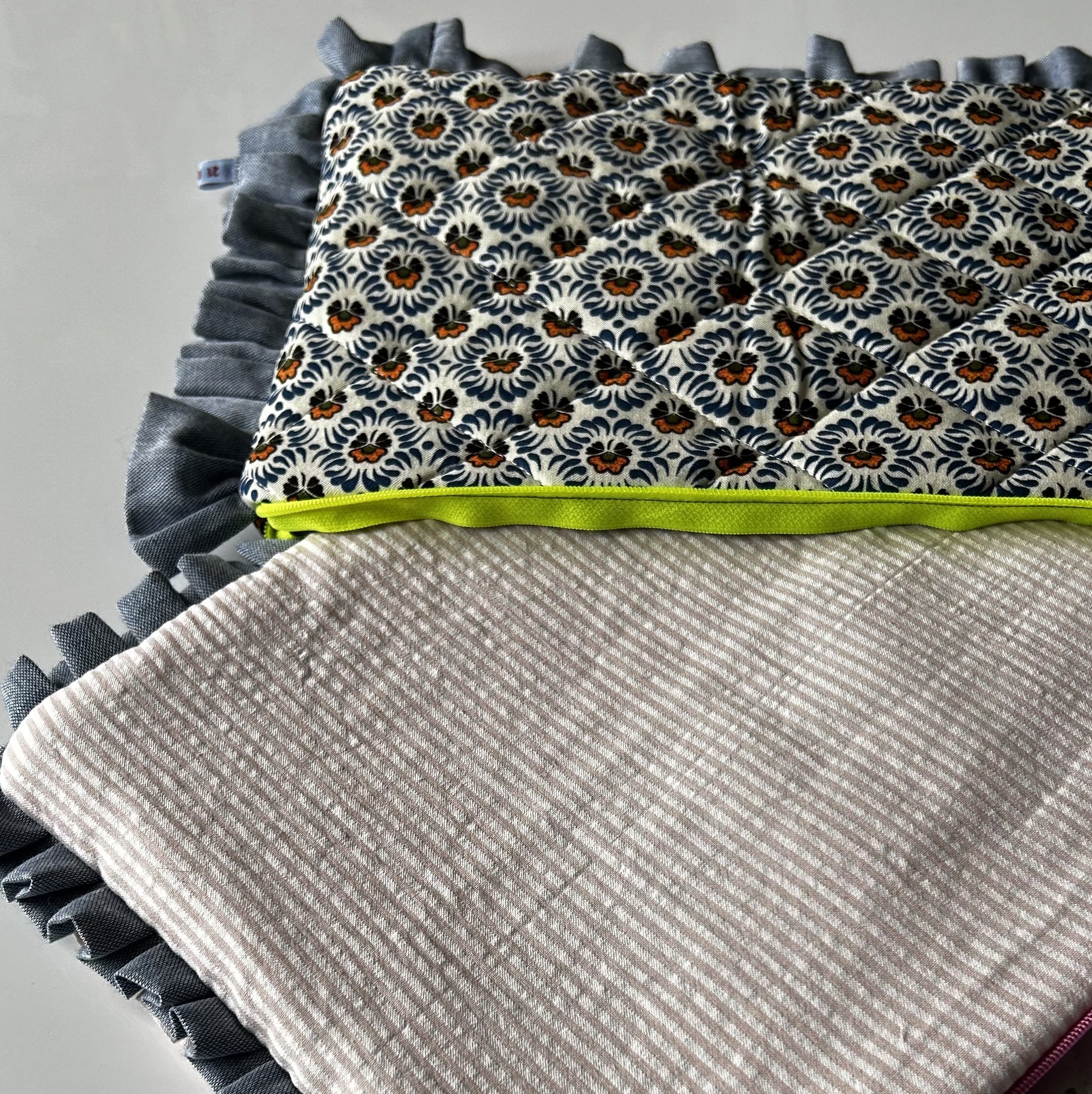 Chaque pochette à froufrous est réalisée à la main, souvent à partir de tissus de récupération. Cela signifie que les motifs et les formes peuvent légèrement varier, rendant chaque pièce unique.